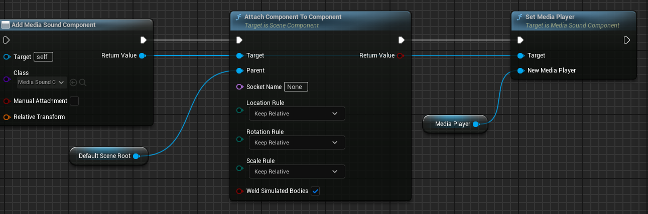在构造完媒体资产之后,在使用AddComponentByClass节点动态为屏幕蓝图创建MediaSoundComponent组件,并动态的为组件设置MediaPlayer,这样就可以使用SetVolumeMultiplier设置媒体音量而不影响内容显示了。